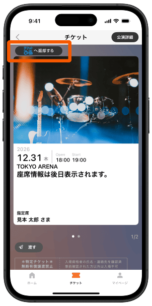 チケット券面の左上の【チケットぴあへ返却する】ボタンを押して返却を行い、案内にしたがって払い戻し手続きをおこなってください。