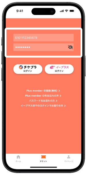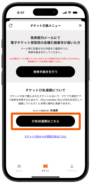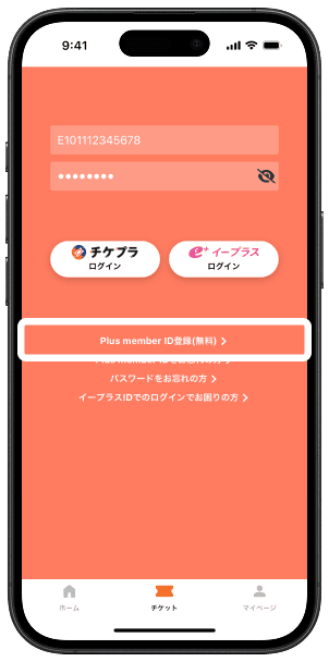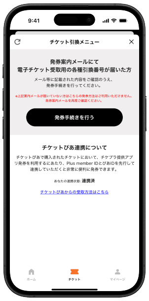 チケットの発券(受け取り)にはPlus member IDが必要です。