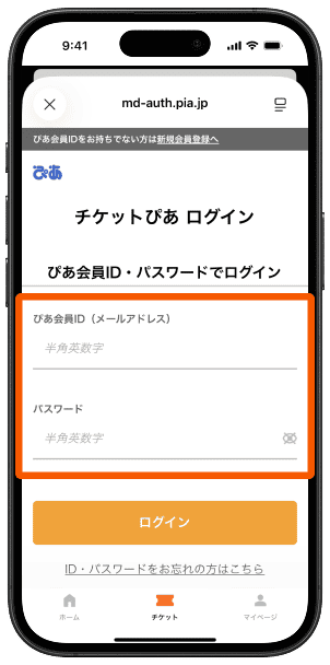 チケットぴあのログイン画面に遷移します。チケットを購入したぴあ会員IDでログイン操作を行ってください。