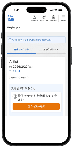 発券案内のメール(件名:【チケットぴあ】電子チケット発券のお知らせ)は【チケットぴあ】からご登録のメールアドレスにお送りいたします。