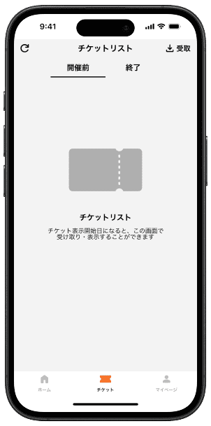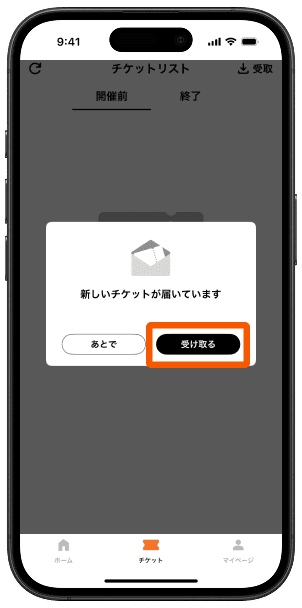 チケットタブを押すと、自動で受取案内のポップアップが表示されます。【受け取る】を押してください。