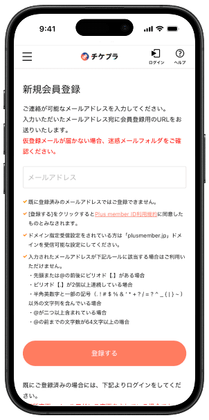 Plus member IDの作成に使用するメールアドレスを入力して、利用規約に同意し、【登録する】を押してください。