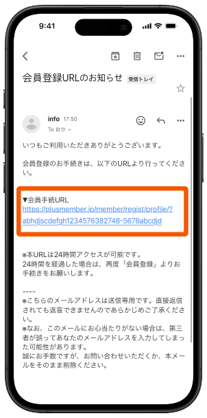 ご登録いただいたメールアドレス宛に会員登録用のURLが届きます。URLを選択して手続きを進めてください。