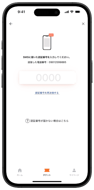 携帯番号を入力すると、SMSメッセージに認証番号が届きます。届いた認証番号を入力してください。
