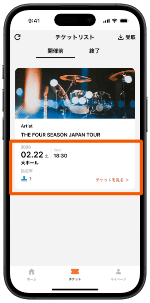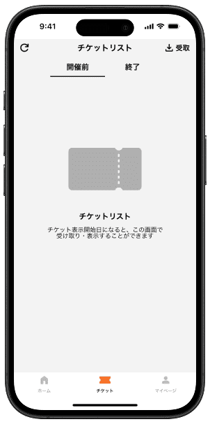 アプリストアで「チケプラ電子チケットアプリ」をダウンロードし起動します。チケットタブからチケットを購入したIDでチケプラログインをしてください。