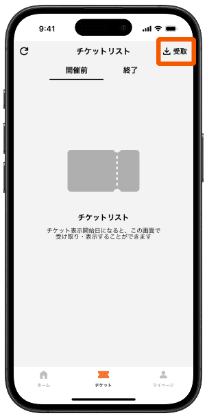 STEP.1が完了した状態で、チケットタブの右上にある【受取】を押してください。
