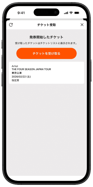発券する公演内容を確認して【チケットを受け取る】を押してください。「受け取り完了」のポップアップが表示されます。