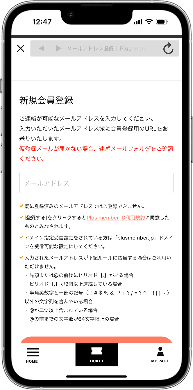 Plus member IDの作成に使用するメールアドレスをご登録ください。