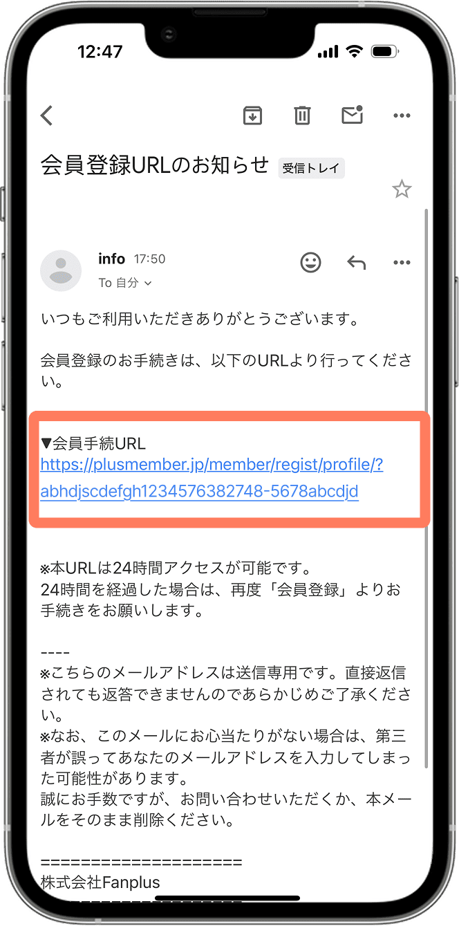 ご登録いただいたメールアドレス宛に会員登録用のURLが届きますので、URLを選択して手続きを進めてください。