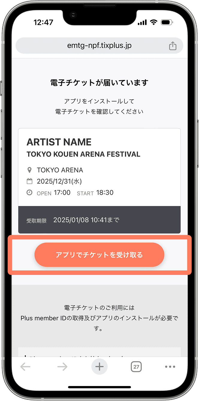amazarashi 公式アプリをダウンロードし、チケットメニューを開きます。Plus member IDをお持ちの方は、ログインをしてください。