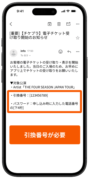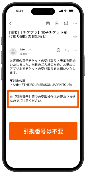 お客様がチケットを購入されたプレイガイド(チケットぴあ、イープラス、ローチケなど)に登録しているメールアドレス宛てに、チケプラよりメールをお送りしております。