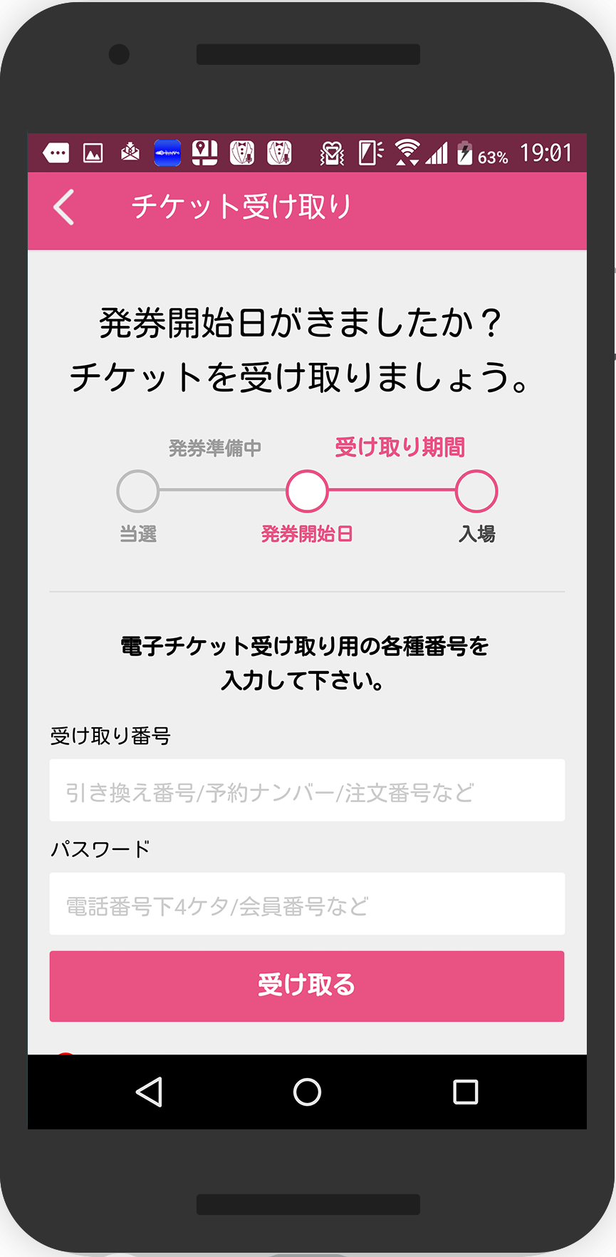 STEP 1で受信したメールに記載されている【引換番号】と、応募時に入力した電話番号の【下4桁】を入力して、チケットを受け取ります。