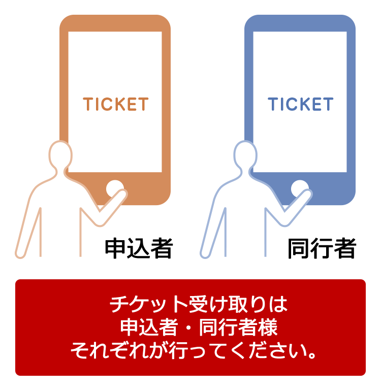 | チケット表示端末 | 申込者・同行者様ともに、お申し込み時に登録した電話番号のスマートフォンでしかお受取り出来ません。 | |