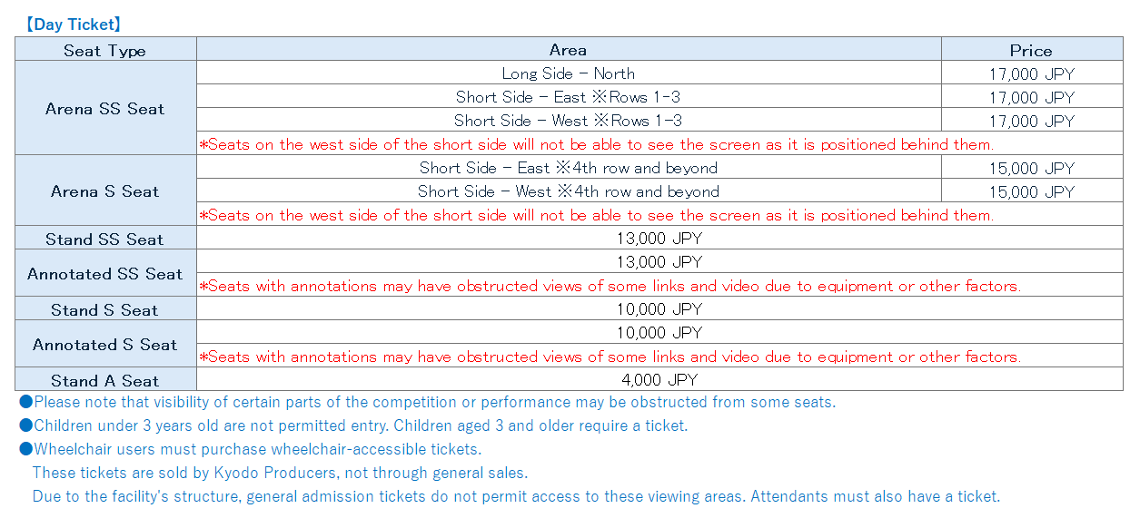 ●You may eat and drink at your table, but please be considerate of other guests around you. ●Please watch the competition from your assigned seat. ●Carry-on bags, suitcases, large luggage, and other items that may inconvenience other guests are not permitted. If you have large luggage, please store it in a locker or similar facility (please note there are no lockers at the venue). ●Throwing flowers or gifts onto the links is prohibited. Please deposit gifts for participating athletes in the designated gift boxes placed within the venue. Please refrain from depositing perishable food items, beverages, or oversized gifts. ●Please refrain from sending flowers, gifts, letters, telegrams, or similar items to the venue via courier or postal service. We are unable to accept them. ●Photography, videography, and audio recording during competitions are prohibited. If such activities are discovered, equipment will be confiscated, data will be deleted, and you will be asked to leave. ●Please refrain from any actions that interfere with the competition or disturb other spectators during the event. ●Support banners may only be displayed as handheld banners at your seat. ●Please be mindful not to disturb those seated nearby. ●Handheld banners must be sized so they do not extend beyond your assigned seat. ●Banners for purposes other than support (including banners deemed to be advertisements by the organizers, such as those displaying company names or product names) are prohibited. ●Banners displayed on venue walls, handrails, or similar surfaces will be removed. ●We cannot be held responsible for disputes between customers. |