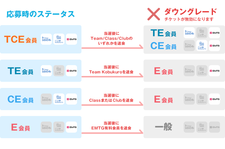 【EMTGを退会した場合】など、チケット先行応募時と現在の会員ステータスが変更となっている場合です。