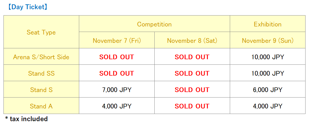 ●You can not choose section or seat number. ●Children under 3 years old are not allowed to enter. 3 years old and older require a ticket. ●Tickets purchased through non-authorized sales channels are not guaranteed to be valid. ●No refunds will be issued for multiple applications for the same competition date. ●No changes or cancellations are allowed after the purchase is completed. Please confirm the date, venue, seat type, and number of tickets before applying. ●Tickets will not be reissued under any circumstances (loss, disappearance, damage, etc.). ●Please be sure to bring your ID card with you as you may be asked to present it at the entrance. If your identity cannot be verified, you may not be allowed to enter the venue. |