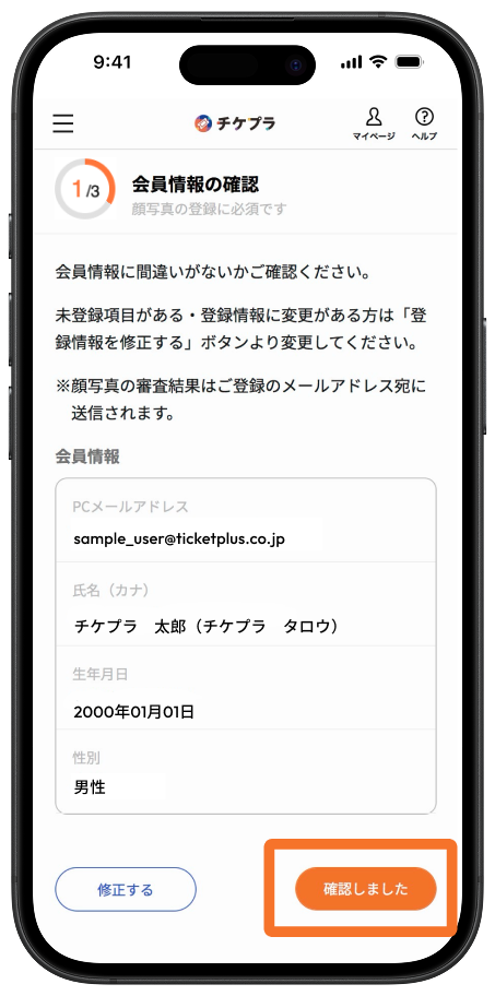 登録情報の内容に相違がなければ、「確認しました」を押してください。