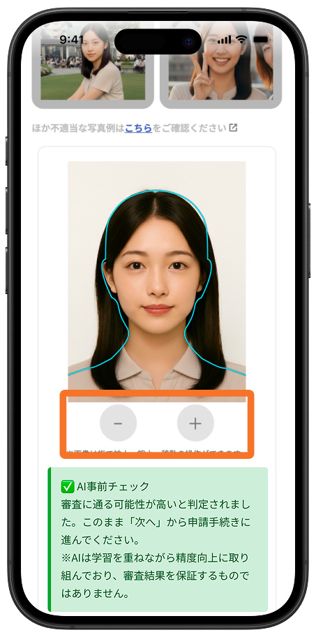 撮影した写真が画面に表示されている青色の人型の枠内に入るよう「+ボタン」「ーボタン」でサイズを変更し、直接写真を触って位置を調整してください。
