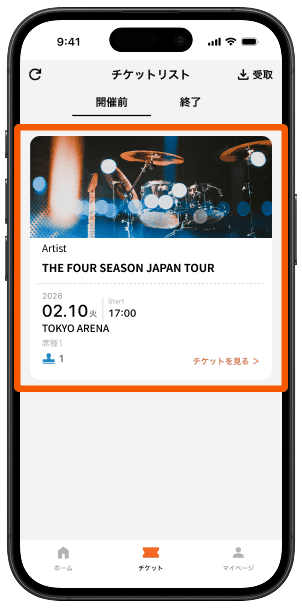 電子チケットアプリの「チケットリスト」に該当イベントのチケットが表示されていることをご確認ください。